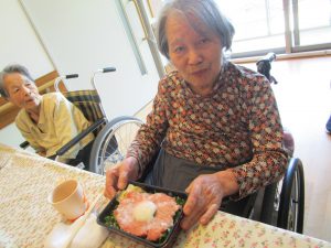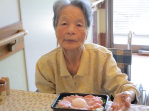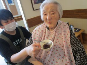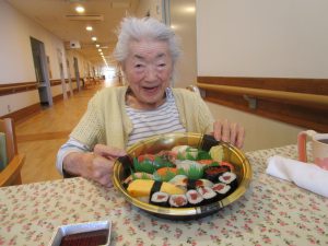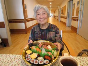 4月21日の昼食時、4月誕生日の利用者様の出前食を行いました。豪華なお寿司を、皆様笑顔で召し上がっていらっしゃいました。家族様よりあんこを使用したお菓子の希望があった利用者様には職員が大宮そごう内にある和菓子屋「とらや」にて「ゆるるか」という柔らかく、甘みが強い羊羹を召し上がって頂きました。