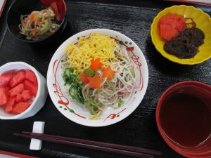3色のそうめんと錦糸卵やおくら、人参など具だくさんで