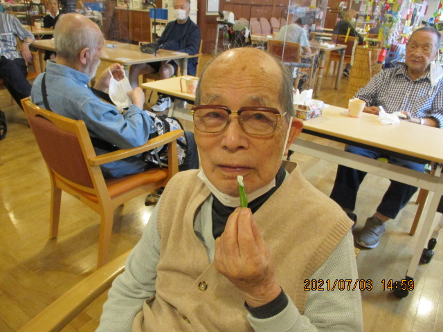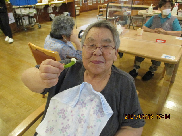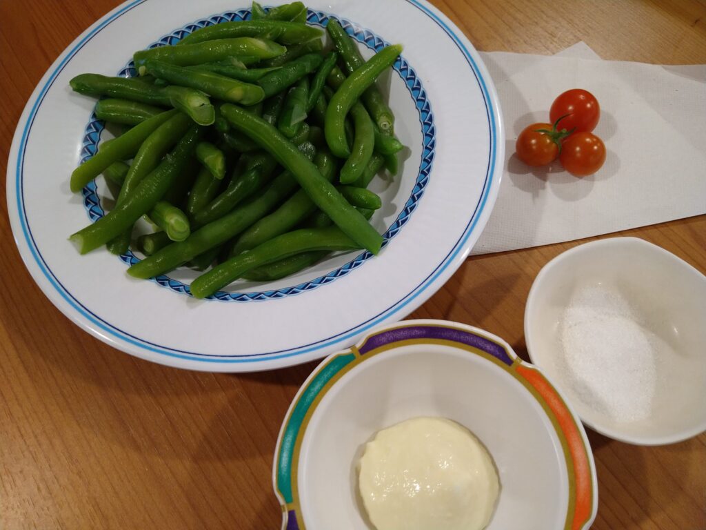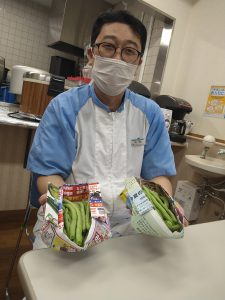 厨房石田チーフにお願いし、サッと茹でてもらい皆で試食。マヨネーズ又は塩をお好みで付けてパクリ!「美味しい!!」ほんの少しでしたが柔らかくて美味しい旬のインゲンを堪能できました。