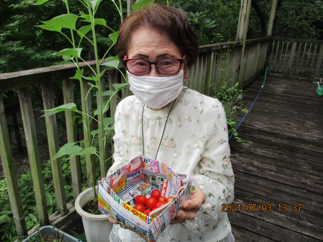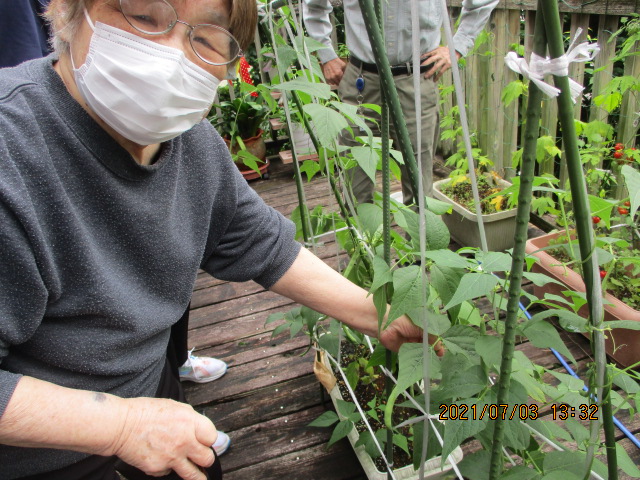 7月3日(土)午後の雨上がり、ベランダ菜園のインゲンを収穫をしました。