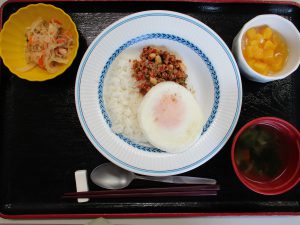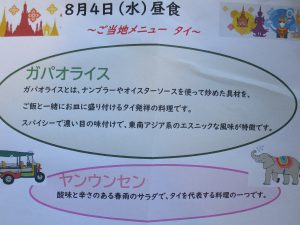 本日はタイのご当地メニューで ”ガパオライス・五目スープ・ヤムウンセン・マンゴー” でした。
