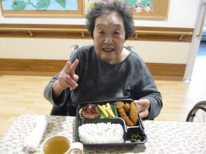 今回は好きなお弁当を選んでいただき召し上がって頂きました。フライの盛り合わせとハンバーグのお弁当をとても楽しみにされて頂いたようでお弁当をお渡しすると「とてもおいしそうだね」と喜ばれておりました