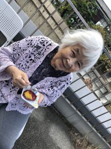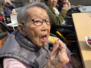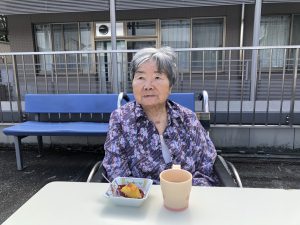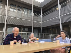 10月9日例年であれば外出して紅葉見学を行っていました。コロナ禍の昨今、外出しての紅葉見学は難しく、寒くなる前に少しでもお外で季節を感じていただけるよう晴れた日の午前と午後で二階、三階で分けて二階テラスにてお茶会を行いました。当日は天気も良く晴れた中お茶会を行うことができました。また当日はお茶うけとしてスイートポテトをお出しいたしましたが皆さんとても喜んでいただき談笑されながら召し上がっておりました。