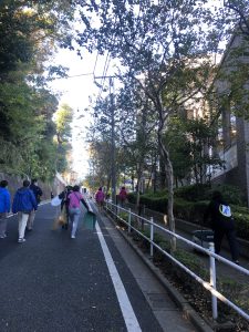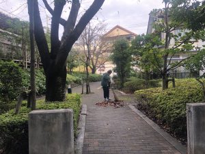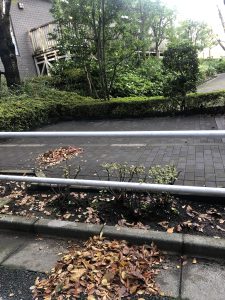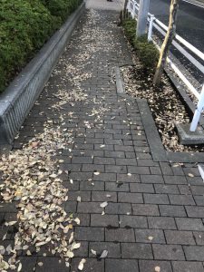 秋らしい景色でもありますが、滑りやすく、危険でもあります。風の強い日の翌朝などは、沢山の落ち葉が道路にまで積もっています。そんな日は職員で落ち葉掃きをしています。