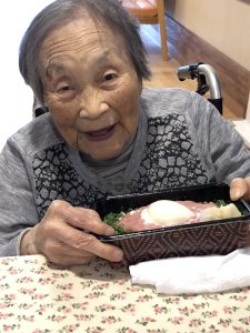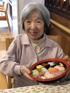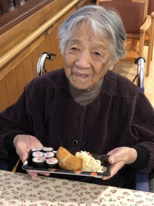 お食事は皆さんの希望によりお寿司を注文しました。届いたお寿司を皆さんにお渡しすると「わぁ美味しそう」等話されとても嬉しそうなご様子がみられました。