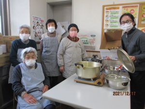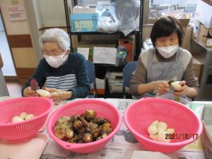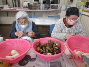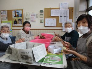 デイサービスのご利用者4人と塩坂栄養士、デイ小林職員6人で皮むきから行いました。