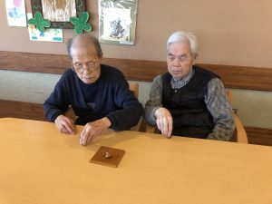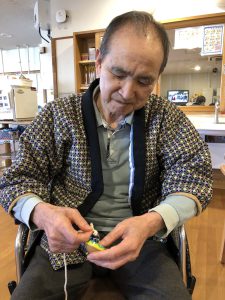中には「駒なんか回せないよ」と話していたご利用者様がいらっしゃいましたが、自分で駒のひもを巻き上手に回して楽しまれておりました。