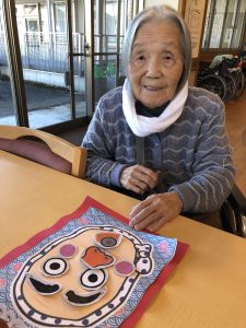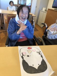 お正月遊びとして福笑い、駒回し、かるた、けん玉など様々なおもちゃを用意したところ、皆さんとても懐かしがって「楽しそうね」と笑って遊びに入ってくださいました。