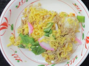 錦糸玉子、紅ショウガなどを彩りよく散らし、切り分けて食べるそうです。