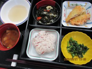 本日は、『桜ご飯、赤だし汁、天ぷら盛合せ、若竹煮、菜の花と湯葉の和え物』でした。
