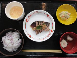 本日のメニューは”ゆかりごはん、カツオのたたき、すまし汁、