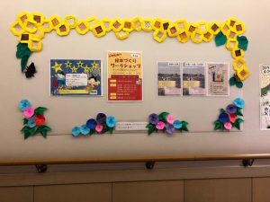 成増図書館に飾られるひまわりやアサガオ等の折り紙を作成しました。