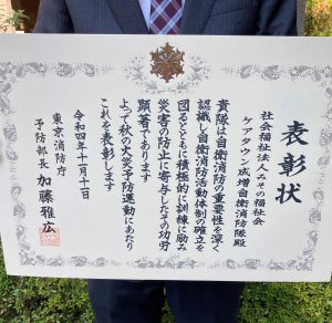 東京消防庁部長感謝状・表彰状の贈呈式があり、ケアタウン成増の自衛消防活動体制の確立と継続的かつ積極的な訓練活動が評価され表彰状をいただきました。