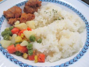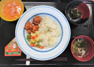 ”バターライス、コンソメスープ、フライドチキン、ポパイソテー、いちごゼリー”です。