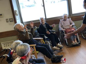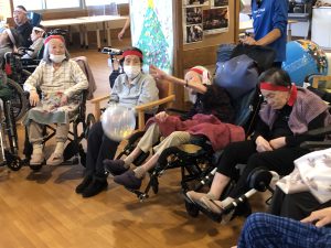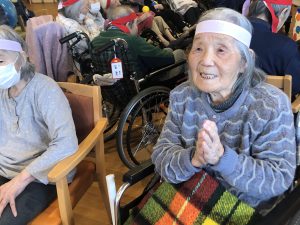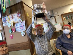 競技は玉回し、玉入れ、風船バレーです。赤チーム、白チーム分かれて行いましたがどちらのチームも一生懸命ボールや風船を目で追い、積極的に参加されておりました。勝利されたのは2階赤チーム、3階はチームでした。
