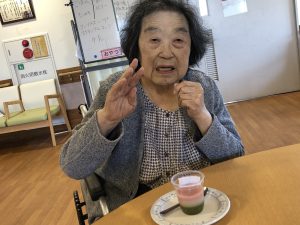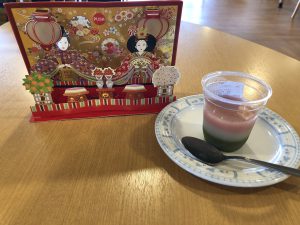 一階のひな壇は7段飾りでとても見応えのある雛人形となっておりました。皆さまで一階の雛人形を見に行くと目に入った瞬間多くの人が「これは立派な雛人形だねぇ」「すごいねぇ」と第一声を上げておりました。中には「こんなに立派なのは家にもなかったなぁ」「昔は毎年よく飾ってたな」と色々と話して下さる方もいらっしゃいました。翌4日は喫茶イベントがあり雛祭りの菱餅にちなんで三色羊羹を食べました。「きれいだけど不思議なお菓子だね」と話される方もいらっしゃいましたが「雛祭りなので菱餅に似たお菓子を選びました」と話すと「そうなんだ。美味しそうだね」と笑顔で話されていました。