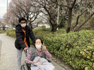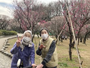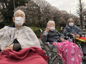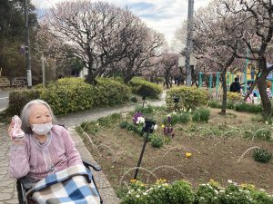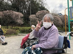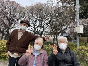 公園を散歩しながら「梅きれいだね」、「外の空気はやっぱり気持ちいいね」や帰るときには「もっとお花を見ていたかったな」など感想がありました。久しぶりの外出だったので、皆さんとても楽しまれていらっしゃるご様子でした。