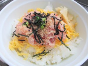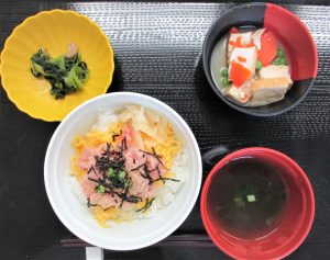 本日のメニューは、“ネギトロ丼・すまし汁・厚揚げの煮物・小松菜の辛子和え”でした。