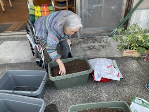 ご利用者様からコツを教えていただきながら、苗を植えました。