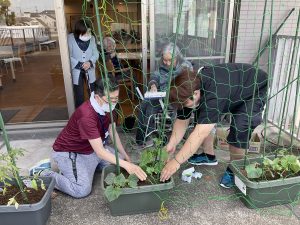 特養2階のテラスに野菜の苗植えをしました!