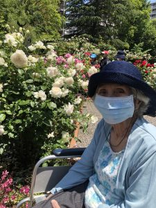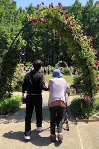 たくさんの品種のバラがあり、色や香りが様々で、ご利用者様もバラの近くで香りを嗅いだりと楽しまれている様子が笑顔から伝わりました。