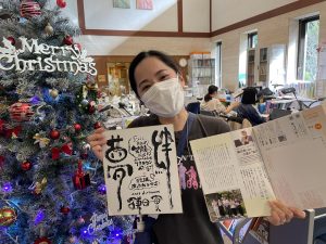 対談後、鎌田先生がキャラクターを務める大王製紙(株)のご担当者が来所され、鎌田先生直筆の色紙および掲載誌の献本をいただきました。対談当日は感染症予防のため残念ながらZOOMでの対談となりましたが、貴重な時間をいただき本当にありがとうございました。