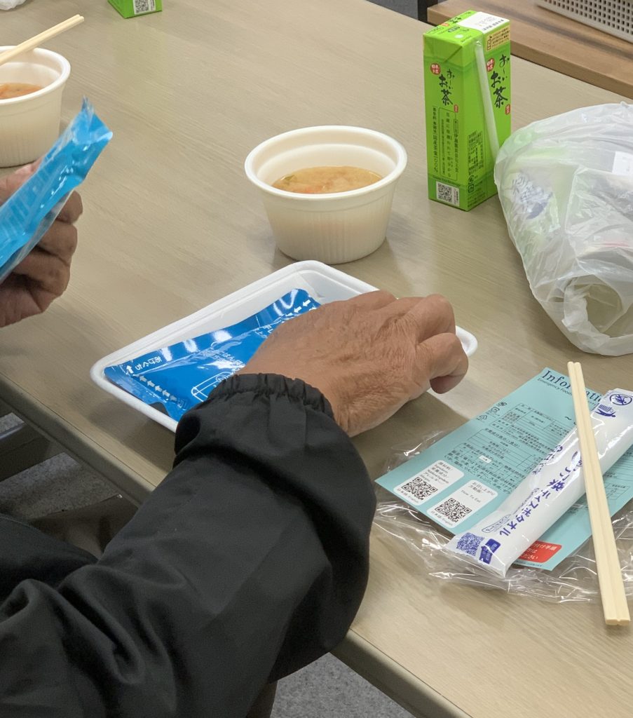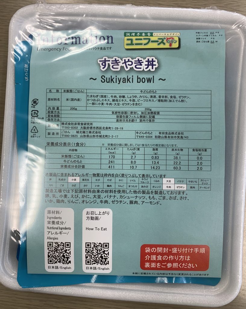 トレーがそのまま容器になり、開封して温めも不要ですぐに食べられるので、発災直後の非常食として備蓄しております。