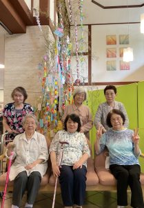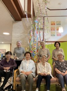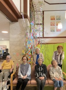 ご利用者様や職員が願いを込めて書いた短冊がたなびく笹飾りの前で記念写真の撮影会。