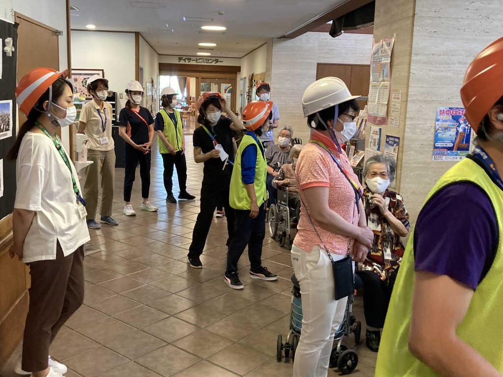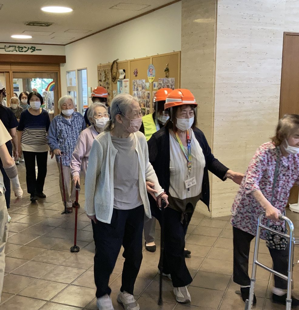 特養の皆様は頭を守る動作、デイサービスの皆様は安全確保後の避難行動に