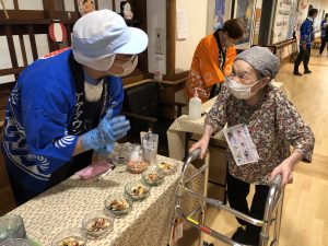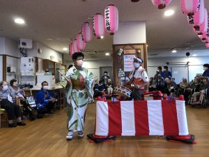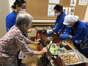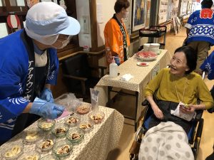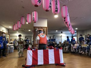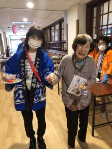 前年と違うのは外部のボランティアさんたちに協力していただいたことです。ご利用者様に少しでもお祭りの雰囲気を味わっていただくため、看板や出店の飾りつけも新たに作り直しました。踊りのボランティアさんたちと一緒にご利用者様も踊りの輪に加わっていただきました。お祭りの時間はわずか2時間弱でしたが、ご利用者様にいつもと違う雰囲気を楽しんで頂けたと思っています。