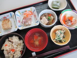 本日の昼食は「お楽しみメニュー」。“赤魚の粕漬焼き” “すき焼き風” “鶏肉の松風焼き”の3種類の中からお好きな物を2種類選んで頂きました。