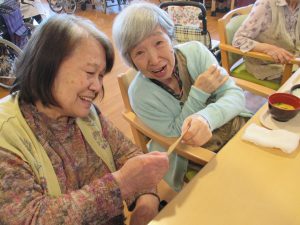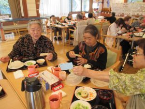 また、厨房職員さんより心のこもった手作りのカードを皆様へ。お一人お一人違う内容で、じっくりと読んでくださったりお隣の方と見せ合ったりと楽しい食事の時間となりました。