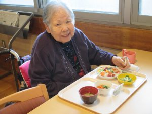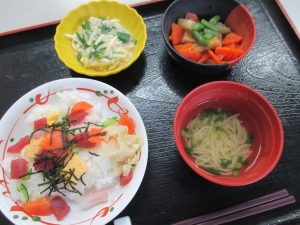 本日の昼食は、月に一度のお寿司の日。“海鮮ばらちらし寿司”でした。夏の間は生ものの提供ができなかったため、久しぶりの登場です。