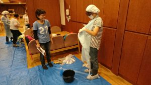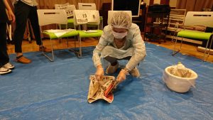 施設には、処理に必要な物品が準備されていることが多いですが、訪問介護員は訪問先のご家庭にある物を自身で選択し対処しなければなりません。その為、基本的な処理方法を一連の流れで学び、ご家庭にある物での対処法についても実践を交えて勉強いたしました。