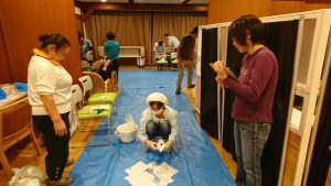 法人の研修においても感染症研修は実施されておりますが、部内研修では、これからの時期に流行が予想されるノロウイルス等の嘔吐物の処理について急な状況に対処出来るように、実践形式で行いました。