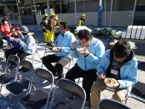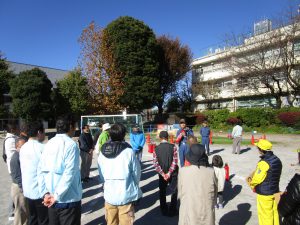 11月23日(金)に成増ヶ丘小学校にて成増第一町会防災訓練と炊出し訓練に男性職員4名が参加いたしました。消防署指導の下、消火器を使用した初期消火訓練、AEDやスタンドパイプの操作訓練、炊出し訓練を実施しました。青空の下、今年も美味しい炊き出しのうどんを頂きました。