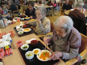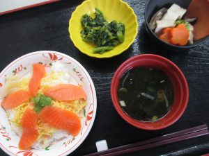 本日のメニューは、『サーモンちらし寿司、赤だし汁、高野豆腐の煮物、春菊の柚子醤油和え』でした。