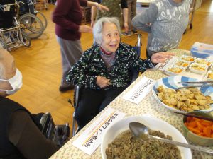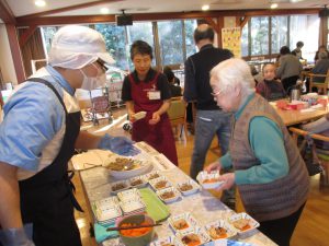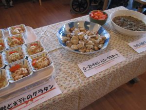 目の前で盛り付けをしている厨房職員の説明に耳を傾けながら「美味しそうねぇ~」とお好きな物を選ばれていらっしゃいました。中でも鮭とポテトのグラタンは大人気!!