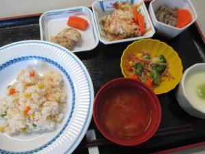 ピラフ・ミネストローネ・ブロッコリーと星人参のサラダ・ヨーグルトケーキの他に、『ローストチキンハニーマスタード』『鮭とポテトのグラタン』『牛肉と赤ワインの煮込み』の中から2種類お好きな物を選んでいただきクリスマスをイメージしたメニューで楽しんでいただきました。