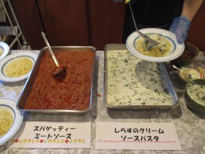 本日は、『スパゲッティーミートソース』と『しらすのクリームソースパスタ』のどちらかお好きなソースを選んでいただきました。目の前でお好きなソースをたっぷりかけていただきました。