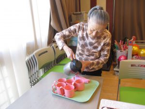 お茶を入れたりご飯をよそったり、また職員が盛り付けたおかずを配ったりと手分けをしながら