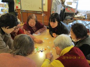 本日、トライ式高等学院の高校生5名と引率の先生がボランティアとしてディサ-ビスへ来てくださいました。引率の先生は教職をされながら演歌歌手を目指されてるとお話され皆様がお馴染みの歌を披露して下さいました。生徒の方たちはご利用者様との交流を目的とされ、各テ-ブルに入って頂きご利用者様と一緒に言葉作りゲ-ムをしました。「若い人は頭の回転が早いわね~」と感心される皆様。和やかに会話を楽しまれ賑やかな午後のひとときを過ごされました。