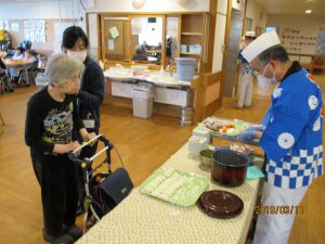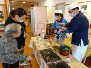 利用者様はお寿司の好きな方が多く、おかわりを待つ列ができる程でした。感想を伺うと、「美味しかったよ、次はいつ食べられるのかしら?」と早くも次回開催を待ち望まれていました。