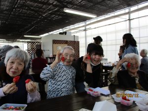 3月6日12日の2日間で特養のご利用者様とディサービスのご利用者様合同で、いちご狩りに行きました。お天気にも恵まれ、晴天の中いざ出発。30分の食べ放題でしたが、皆さん手が赤くなってしまう程夢中でイチゴを召し上がっていました。いちごはとても大きくて甘く、多く食べた方で30個程召し上がっていました。帰りのバスの中は、甘いイチゴの香りでいっぱいになり、皆様笑顔でとても満足そうでした。一足早く春を感じられた楽しいいちご狩りになりました。