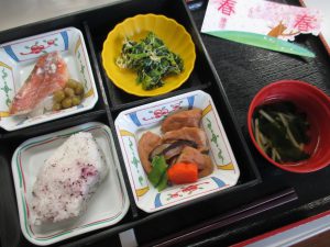 本日の昼食は、“春のお花見弁当”でした。お弁当箱に盛り付けをおこない桜満開のカードを添えて、