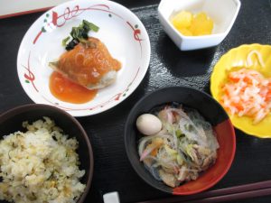 また太平燕(タイピーエン)、甘夏みかんも熊本県の郷土料理や生産量が日本一ということでメニューに組み込んでみました。献立の説明をしている職員に耳を傾けてじっくり聞かれており、また一つ一つ味わうように召し上がっている方もいらっしゃいました。