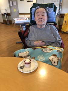 雪の帽子のようなホイップクリームをイチゴジャムで囲んだシャトレーゼの「ホイップクリーム苺プリン」を召し上がって頂きました。