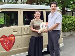 当日は、高島平キッチンカーコミュニティ 代表 高木 智子様にお米数袋をお渡しし、あたごの杜 高島平様にて実施された 「子ども食堂ソレイユ」 にてご利用頂けたとの事です。高島平キッチンカーコミュニティ様は、現在25の高島平周辺で活動されているキッチンカーが所属し、イベントにも多数出店されております。