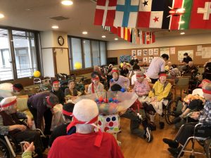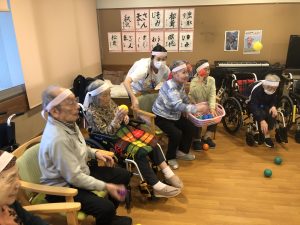 今シーズン1番の冷え込みとなった10月22日に運動会を開催しました。大玉転がし、ボッチャカーリング、玉入れと各フロアで紅白対抗の熱い戦いが繰り広げられました。
