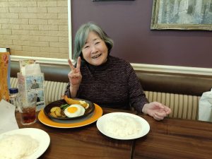 お肉が食べたいというリクエストでジョナサンにしましたが、到着してたくさんあるメニューを見ると驚きながら「やっぱりこれにしようかしら」とうれしい迷いがみられていました。ドリンクバーも注文し、ジュースを取りに行くときも楽しそうに飲みたい物を考えているご様子、更に注文したメニューが届くと目を輝かせ食事中も「美味しい!」ととても満足されていました。